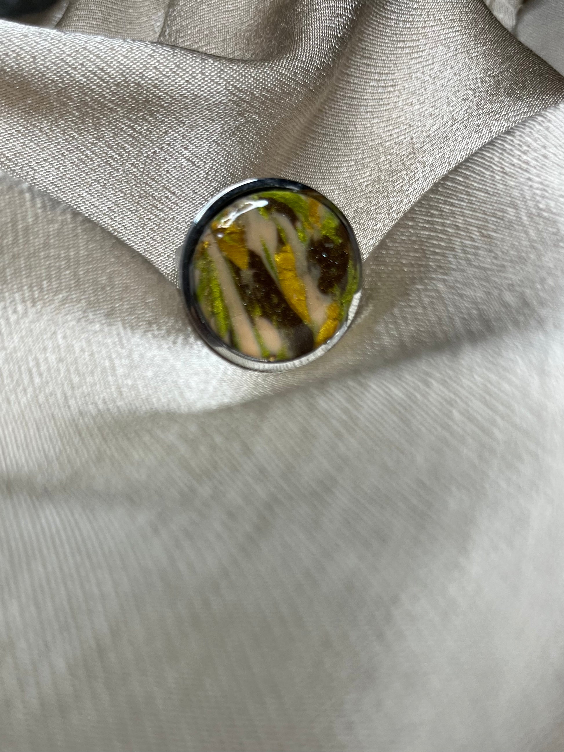De diseño exclusivo, este Anillo Camuflaje se compone de una mezcla de colores tierra y verde con pan de oro, moderno y actual. Creado con arcilla polimérica colorida, acero inoxidable y sellado con resina, su elegancia y resistencia es impresionante. De la mejor calidad, este anillo es la última tendencia para esta temporada.