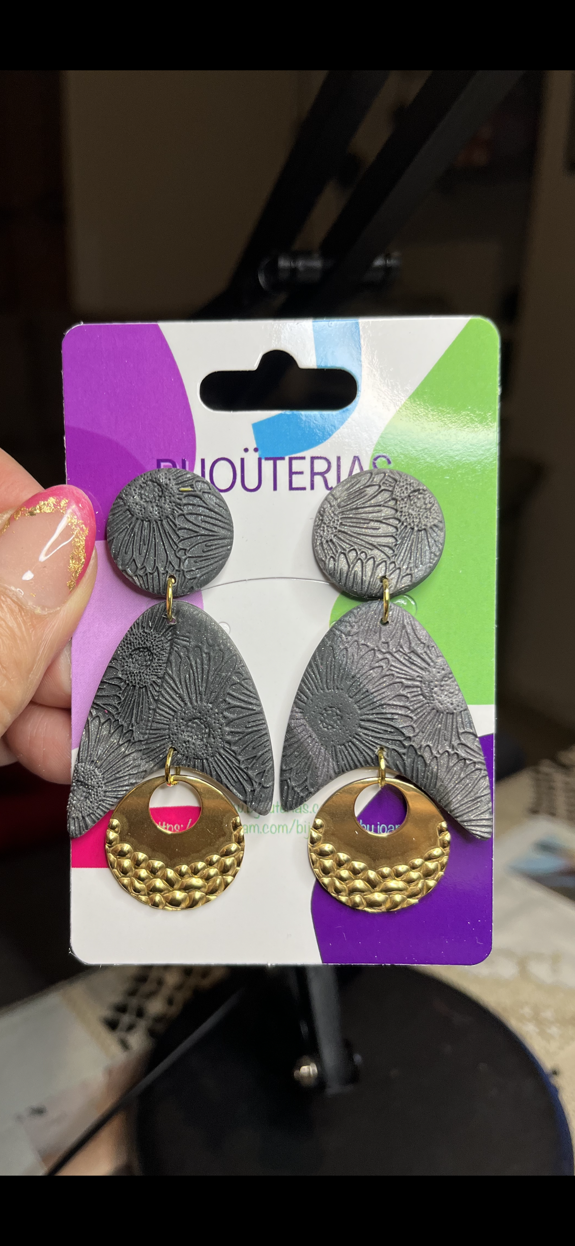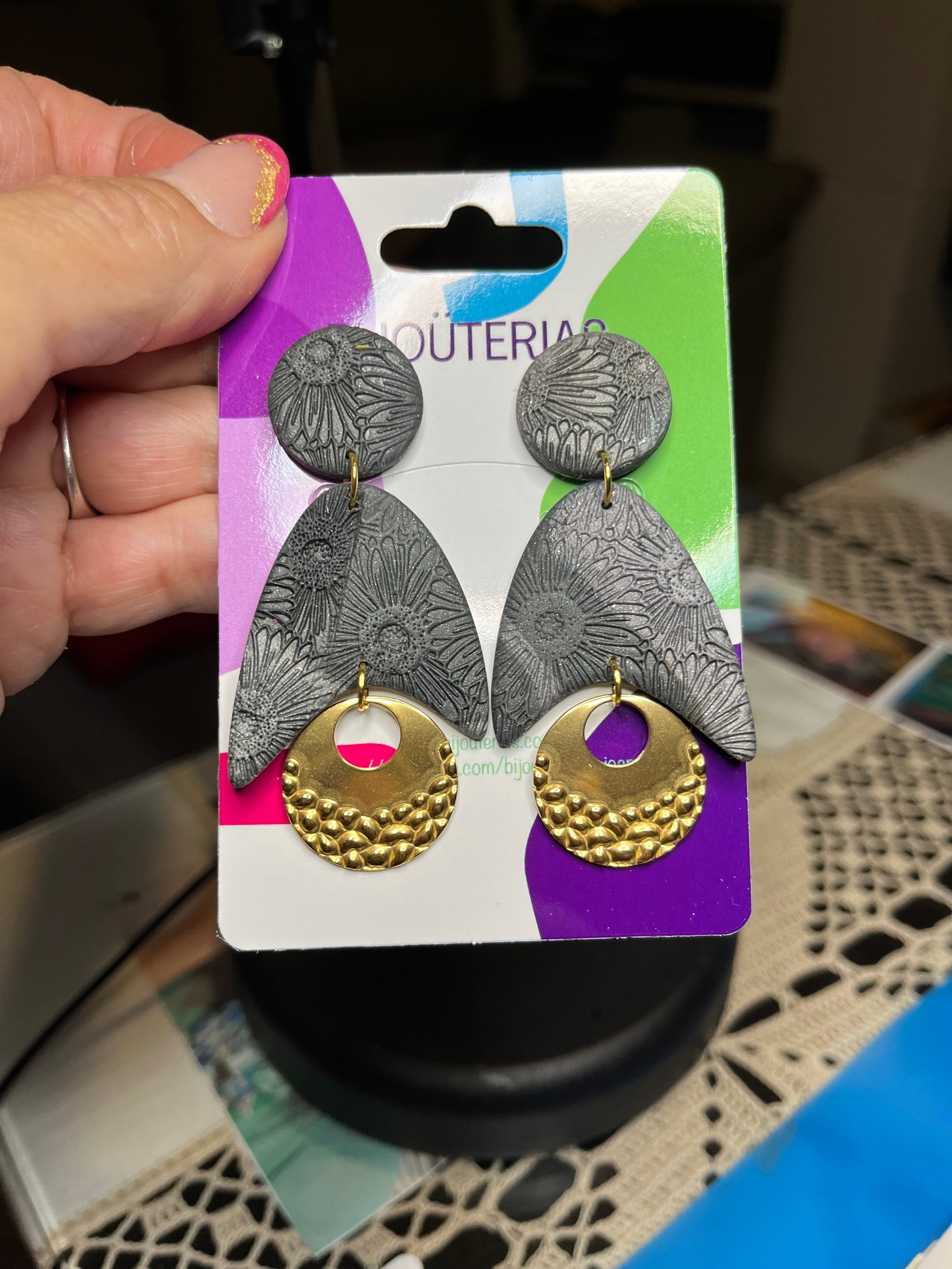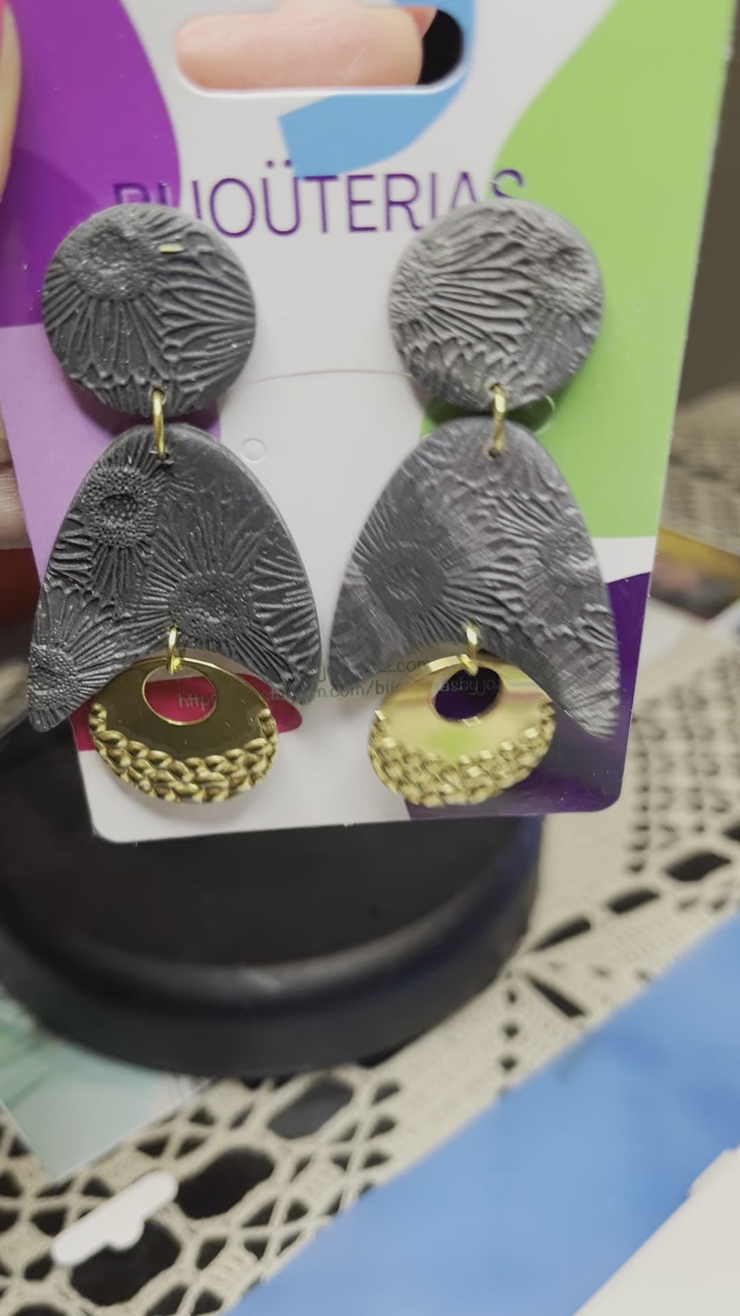 Con dos tonalidades de gris - gris oscuro y gris más claro metalizado - y preciosas texturas en la arcilla polimérica los hacen originales. Tienen un tamaño de 7,5x3,5 cm.