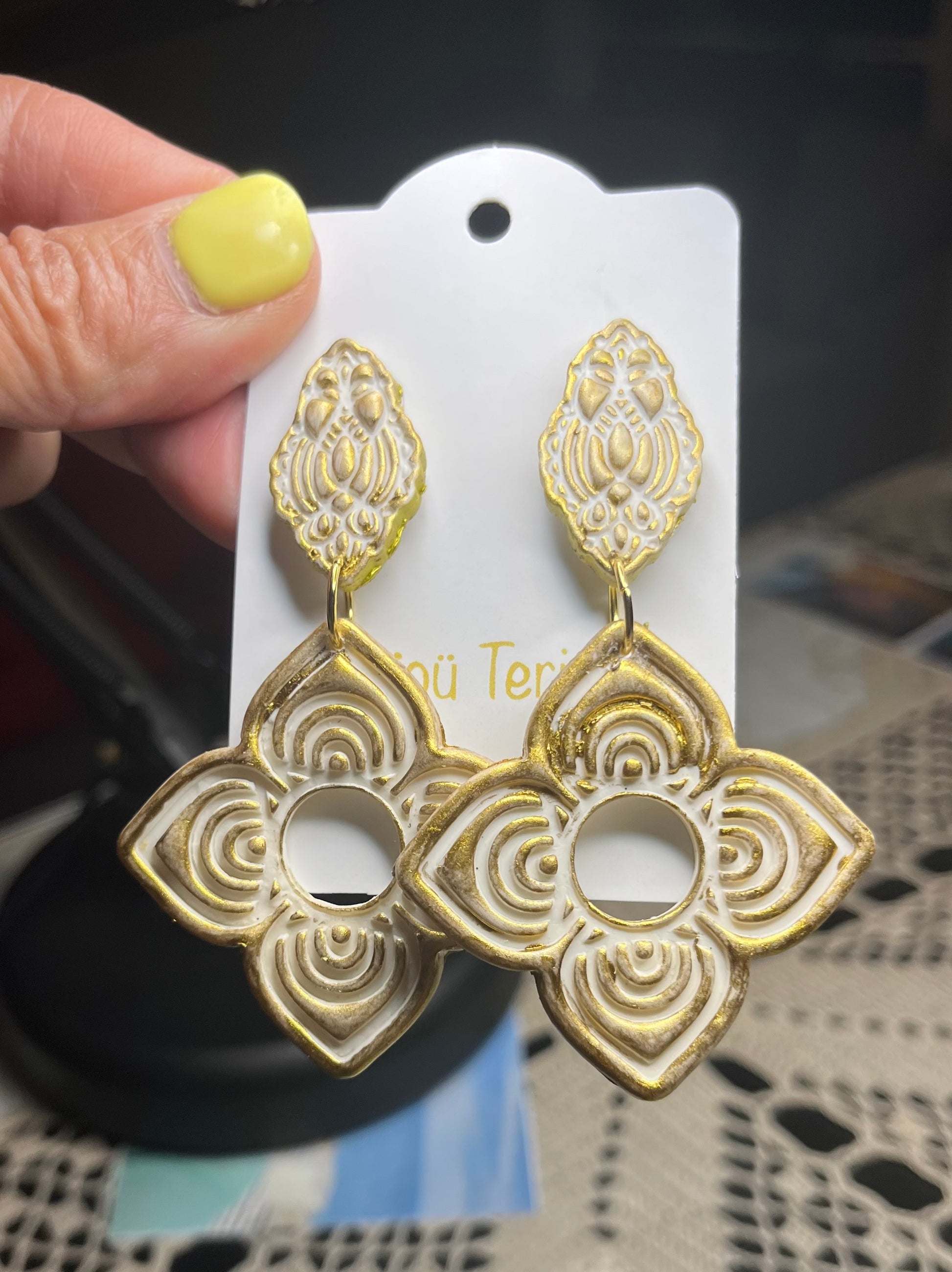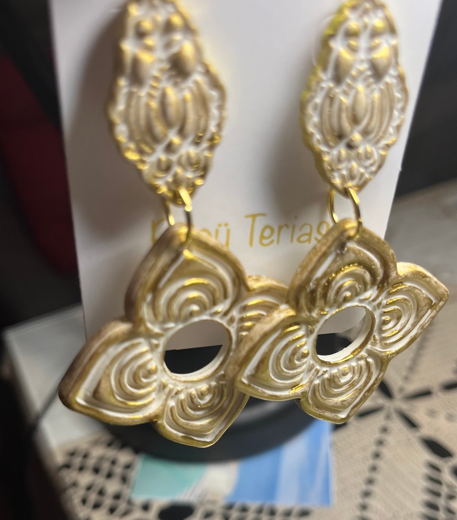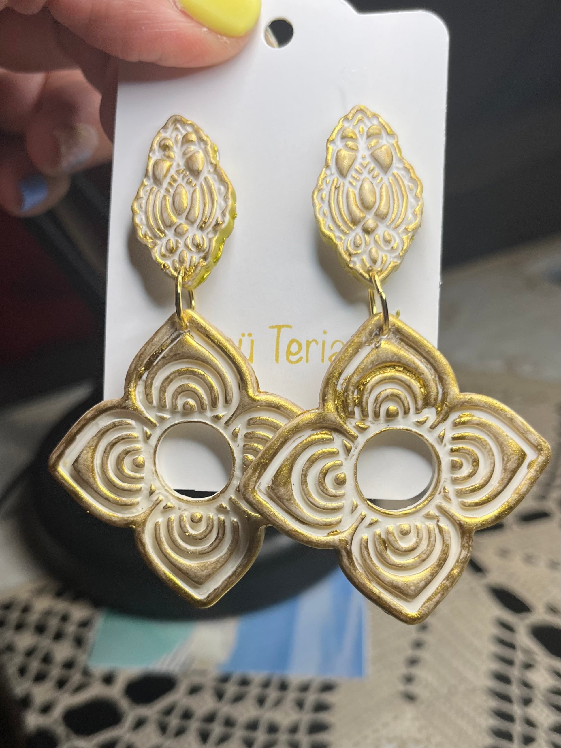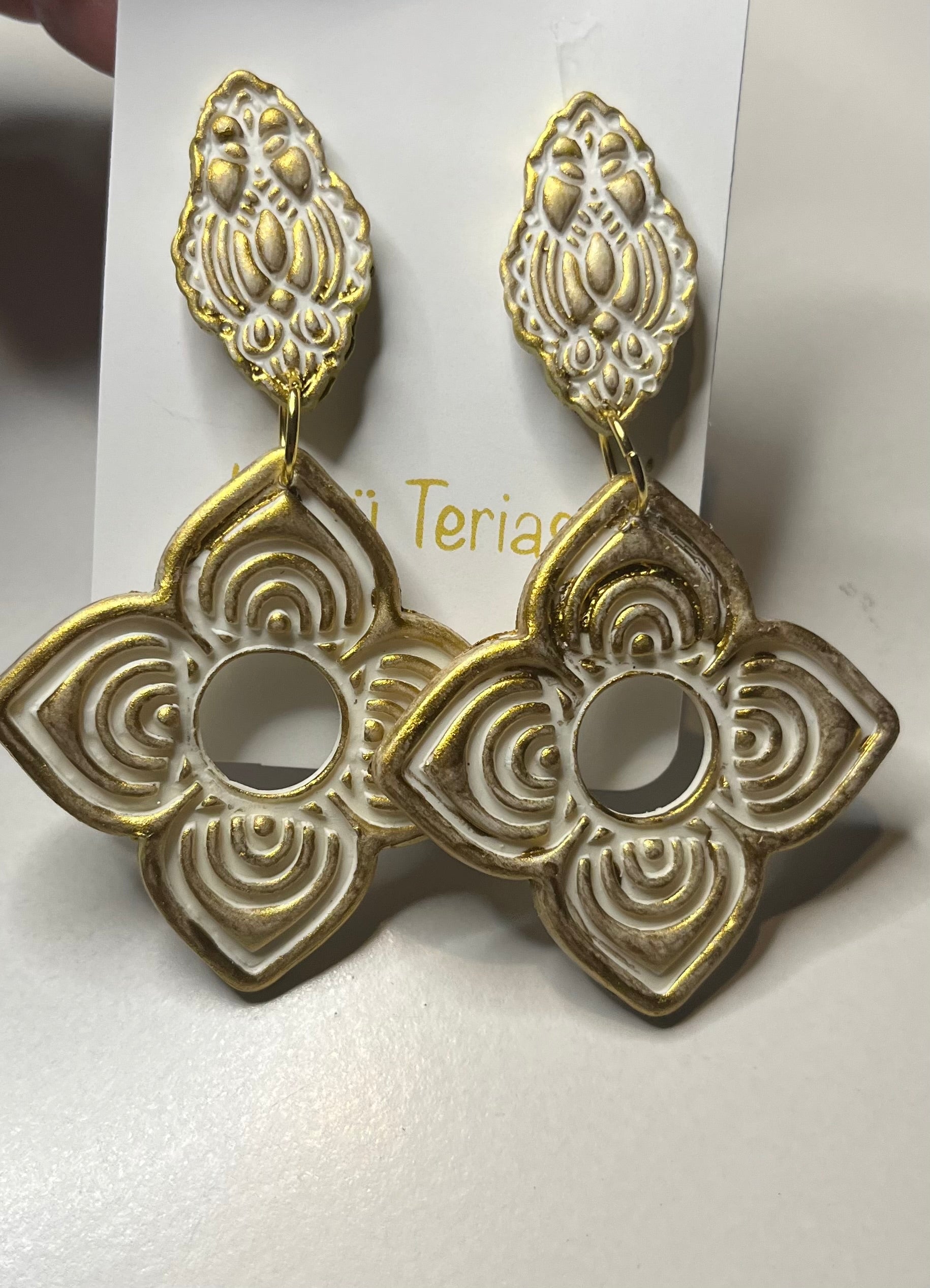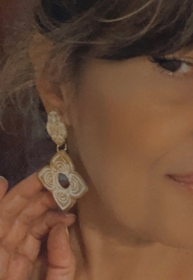 Estos encantadores Pendientes Flor Étnica hechos de arcilla polimérica, acero inoxidable con baño de oro de 18 quilates y su acabado con pintura dorada, son una elección excepcional para cualquier outfit y en especial para una novia en el día más especial de su vida. Diseñados con mucho amor y cariño pensando en el día especial que los podrás lucir, estos pendientes desprenden una belleza sutil y atemporal que complementa perfectamente cualquier vestido nupcial.
