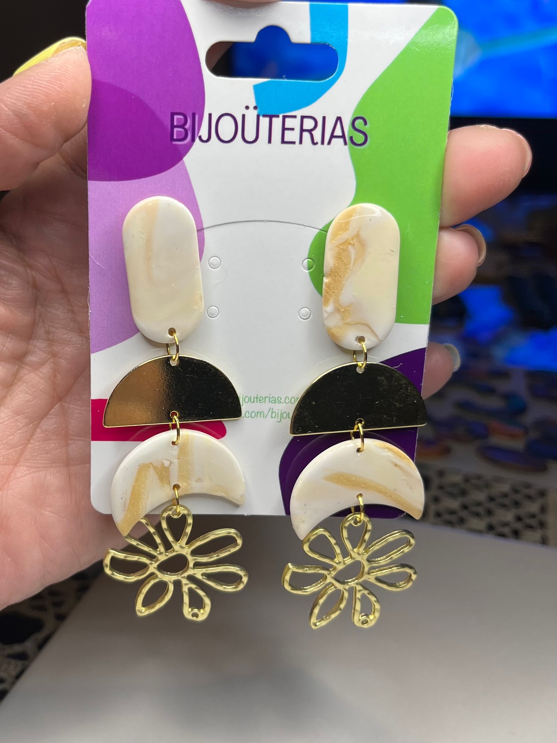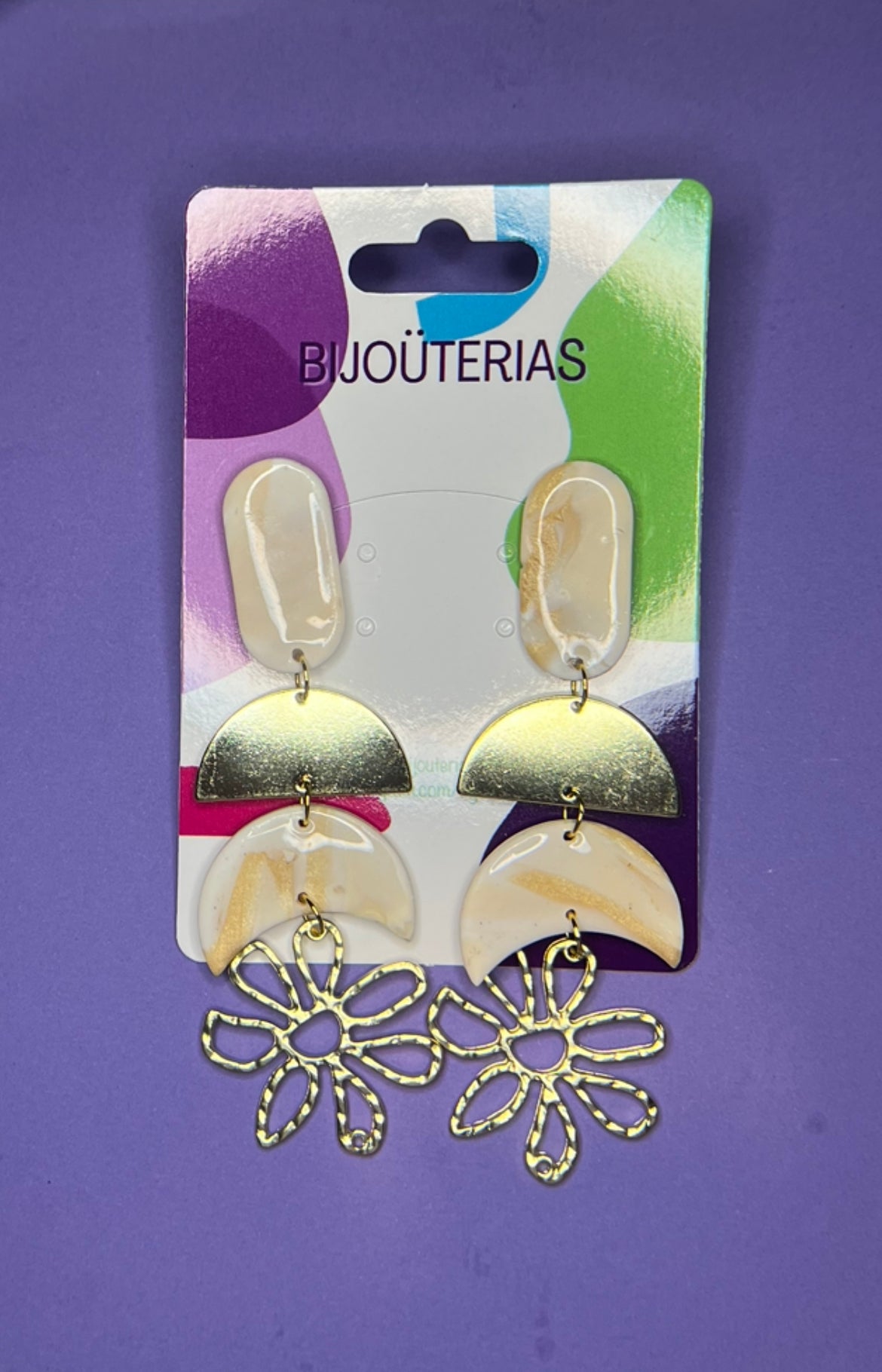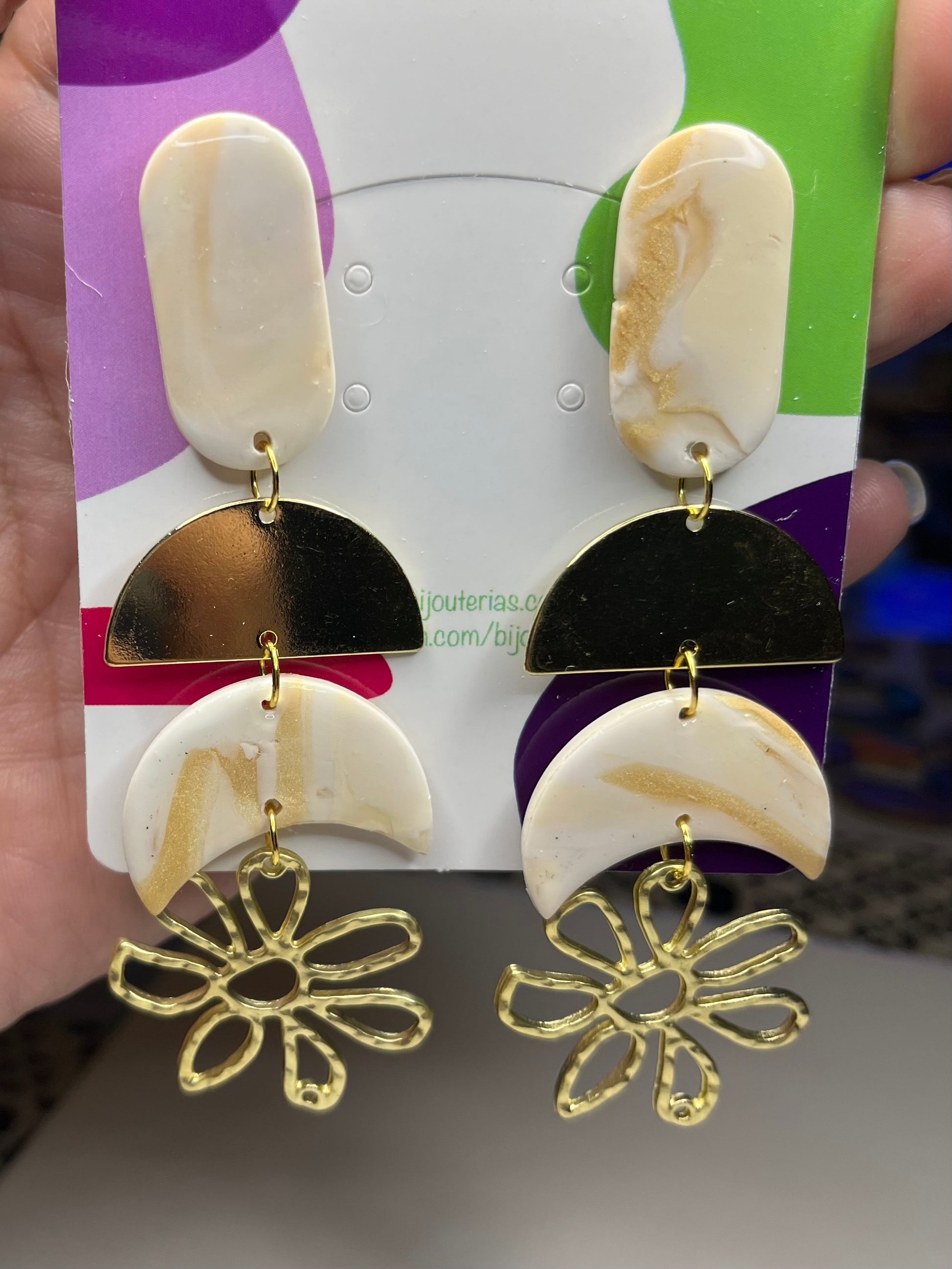 Estos encantadores Pendientes Luna Flor hechos de arcilla polimérica, acero inoxidable con baño de oro de 18 quilates y su acabado de resina, son una elección excepcional para cualquier outfit y en especial para una novia en el día más especial de su vida. Diseñados con mucho amor y cariño pensando en el día especial que los podrás lucir, estos pendientes desprenden una belleza sutil y atemporal que complementa perfectamente cualquier vestido nupcial.