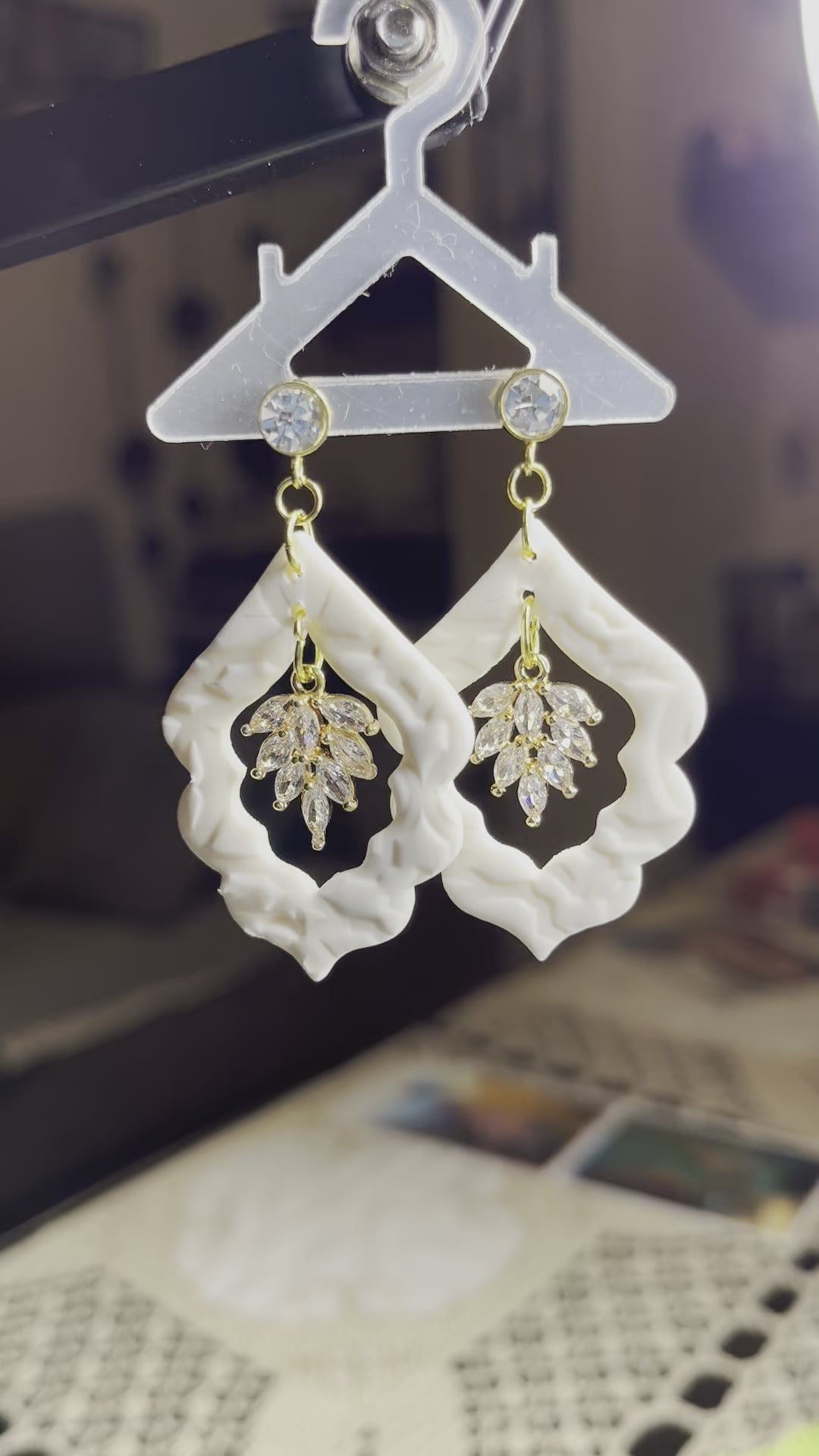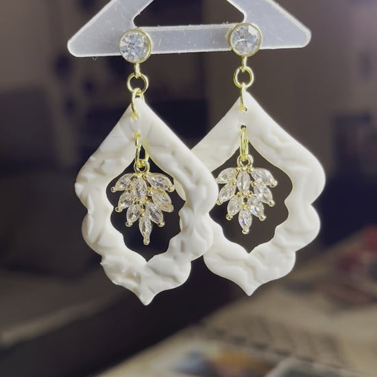 Estos encantadores Pendientes Brillantes de Novia hechos de arcilla polimérica, cristales y acero inoxidable con baño de oro de 18 quilates son una elección excepcional para una novia en el día más especial de su vida. Diseñados con texturas en su color blanco perla, estos pendientes desprenden una belleza sutil y atemporal que complementa perfectamente cualquier vestido nupcial.